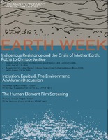 2018 Earth Week Flyer with events such as Indigenous Resistance and the Crisis of Mother Earth: Paths to Climate Justice, Inclusion, Equity & The Environment: an alumni discussion and The Human Element Film Screening.