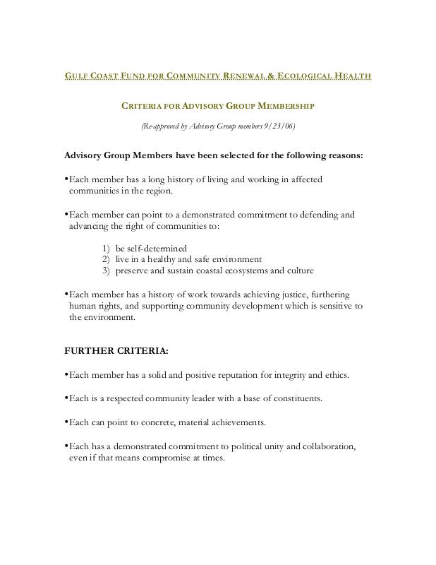 Document: Selection Criteria for Gulf Coast Fund Advisory Group Membership