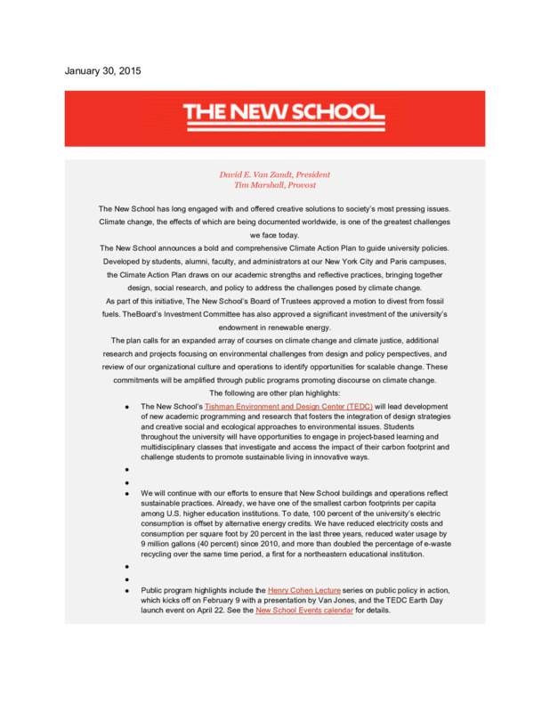 Communication: DVZ Divestment Announcement Email by David E. Van Zandt, The New School President and Tim Marshall, The New School Provost announcing Climate Action Plan to guide university policies. -