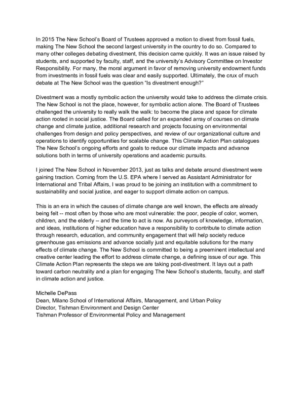 Remarks: 2017 Climate Action Plan Foreword by Michelle DePass Michelle DePass former, director of the Tishman Environment and Design Center, gives the foreword to the Climate Action Plan which catalogues the New School’s efforts and goals to reduce climate impacts and advance solutions both in terms of university operations and academic pursuits. -