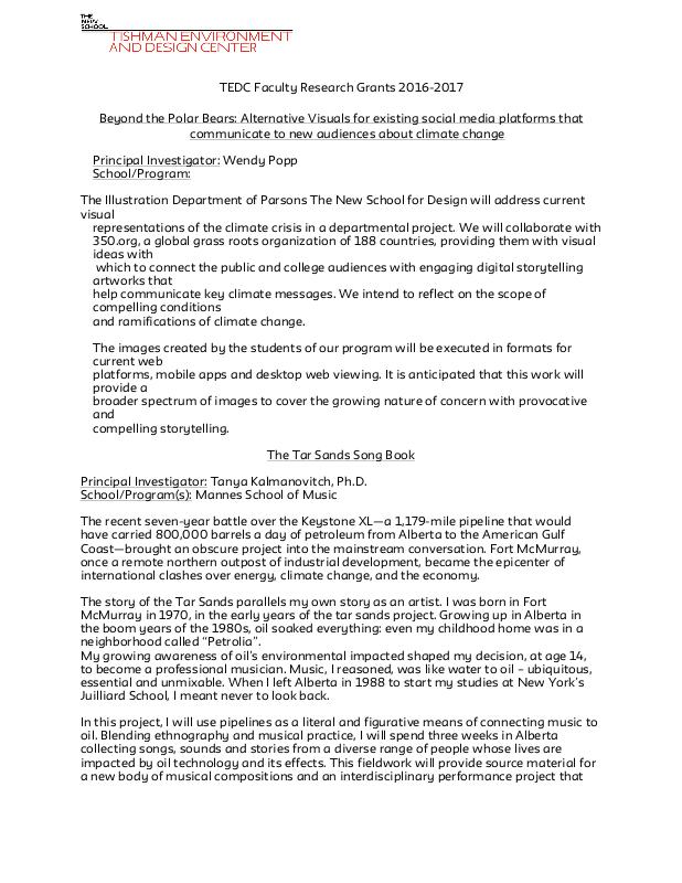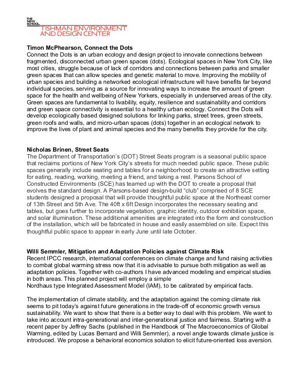 Promotional Materials: Faculty Research Grant Abstracts 2015 TEDC Faculty Research Grants 2015.Includes Timon McPhearson - Connect the Dots, Nicholas Brinen, Street Seats, Willi Semmler, Mitigation and Adaptation Policies against Climate Risk, Ivan Ramirez, Understanding Climate Change and Urban Health Using a Syndemic Modeling Approach, Ana Baptista, Climate Justice: Case Studies of Civil Society in Action and Timo Rissanen, Designing Endurance. -