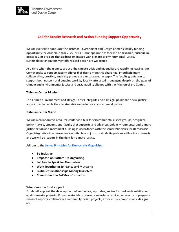 Administrative: Faculty Grant Application Fall 2022 Call for Faculty Research and Action Funding Support Opportunity for the 2022-2023 Academic Year. Grant applications are for those focused on research, curriculum, pedagogy, or projects that address or engage with climate or environmental justice, sustainability or environmentally related design. Faculty grants aim to support both nascent and ongoing work by faculty interested in engaging deeply on the goals of climate and environmental justice and sustainability aligned with the Mission of the Center. -
