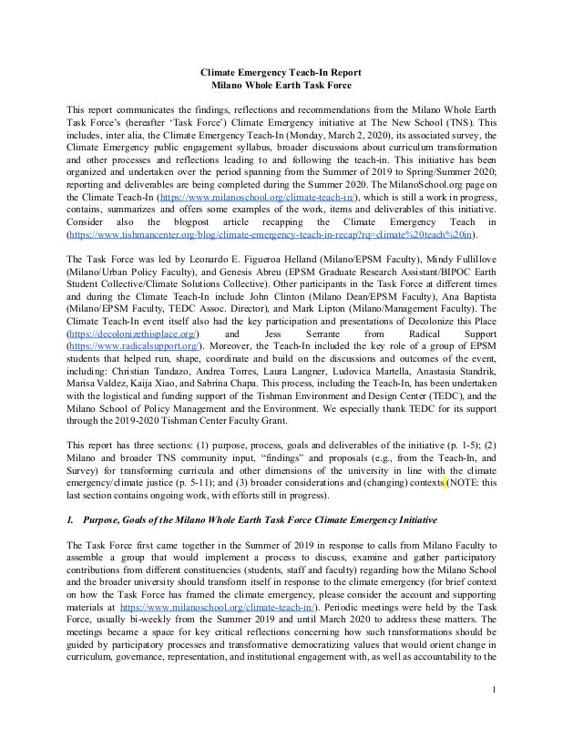 Report: Climate Emergency Teach-In Report This report communicates the findings, reflections and recommendations from the Milano Whole Earth Task Force’s (hereafter ‘Task Force’) Climate Emergency initiative at The New School (TNS). This includes the Climate Emergency Teach-In (Monday, March 2, 2020), its associated survey, the Climate Emergency public engagement syllabus, broader discussions about curriculum transformation and other processes and reflections leading to and following the teach-in. The Task Force was led by Leonardo E. Figueroa Helland (Milano/EPSM Faculty), Mindy Fullillove, (Milano/Urban Policy Faculty), and Genesis Abreu (EPSM Graduate Research Assistant/BIPOC Earth Student Collective/Climate Solutions Collective). -
