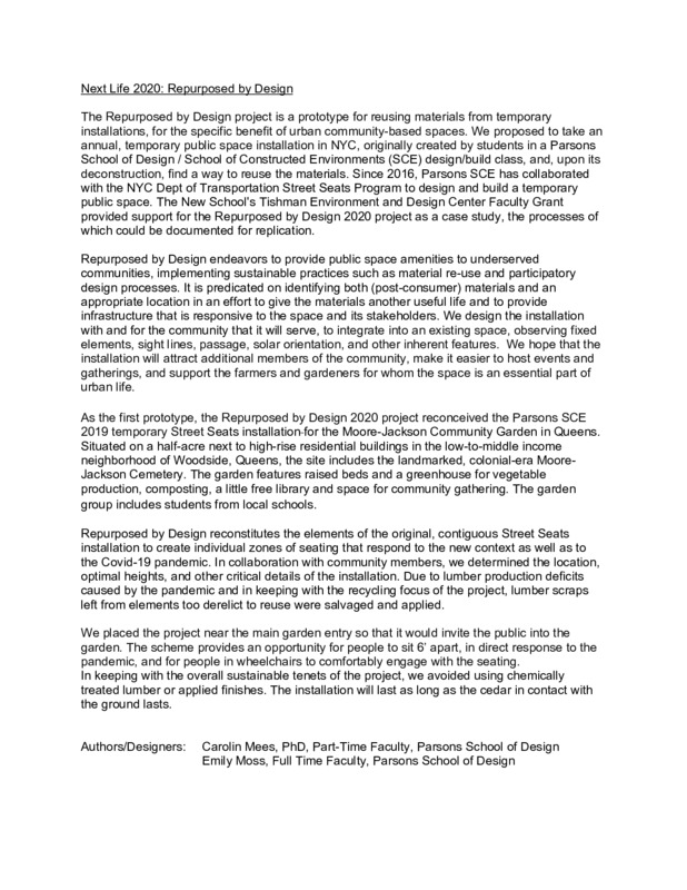 Report: Report back of Repurposed by Design Report back of Repurposed by Design project by Carolin Mees and Emily Moss, 2019 Faculty Grant Recipients.The Repurposed by Design project is a prototype for reusing materials from temporary installations, for the specific benefit of urban community-based spaces. -