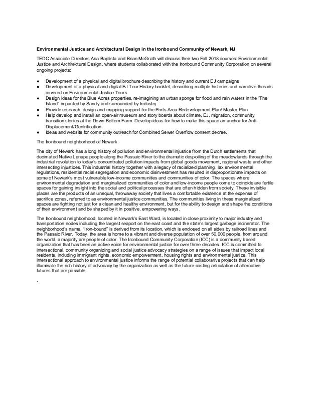Promotional Materials:  Affiliated Faculty Seminar with Ana Baptista and Brian McGrath                        Description of TEDC Associate Faculty Seminar with Ana Baptista and Brian McGrath who will discuss their two Fall 2018 courses: Environmental Justice and Architectural Design, where students collaborated with the Ironbound Community Corporation on several ongoing projects. Promotional Materials:  Affiliated Faculty Seminar with Ana Baptista and Brian McGrath                        Description of TEDC Associate Faculty Seminar with Ana Baptista and Brian McGrath who will discuss their two Fall 2018 courses: Environmental Justice and Architectural Design, where students collaborated with the Ironbound Community Corporation on several ongoing projects.