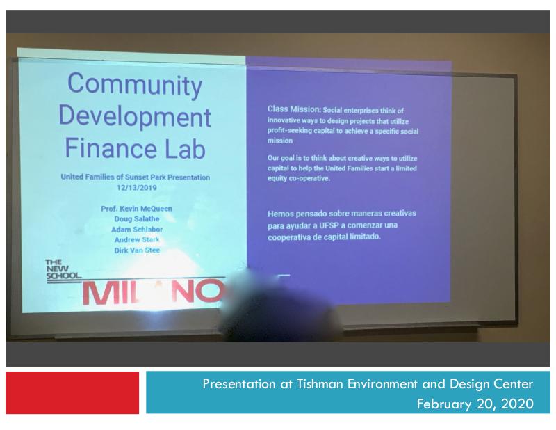 Event: Affiliated Faculty Presentation from Kevin McQueen                        Affiliated Faculty Kevin McQueen presented these slides for his presentation about the Community Development Finance Lab. The lab offers a project-based course featuring classroom instruction, interdisciplinary collaboration, guest lectures, and networking. In his Affiliated Faculty seminar at the Tishman Center, McQueen discussed past student projects and partnerships, including developing a business plan for UPROSE’s community-owned solar project in Sunset Park and creating a sustainability framework for the Jersey City government. Event: Affiliated Faculty Presentation from Kevin McQueen                        Affiliated Faculty Kevin McQueen presented these slides for his presentation about the Community Development Finance Lab. The lab offers a project-based course featuring classroom instruction, interdisciplinary collaboration, guest lectures, and networking. In his Affiliated Faculty seminar at the Tishman Center, McQueen discussed past student projects and partnerships, including developing a business plan for UPROSE’s community-owned solar project in Sunset Park and creating a sustainability framework for the Jersey City government.