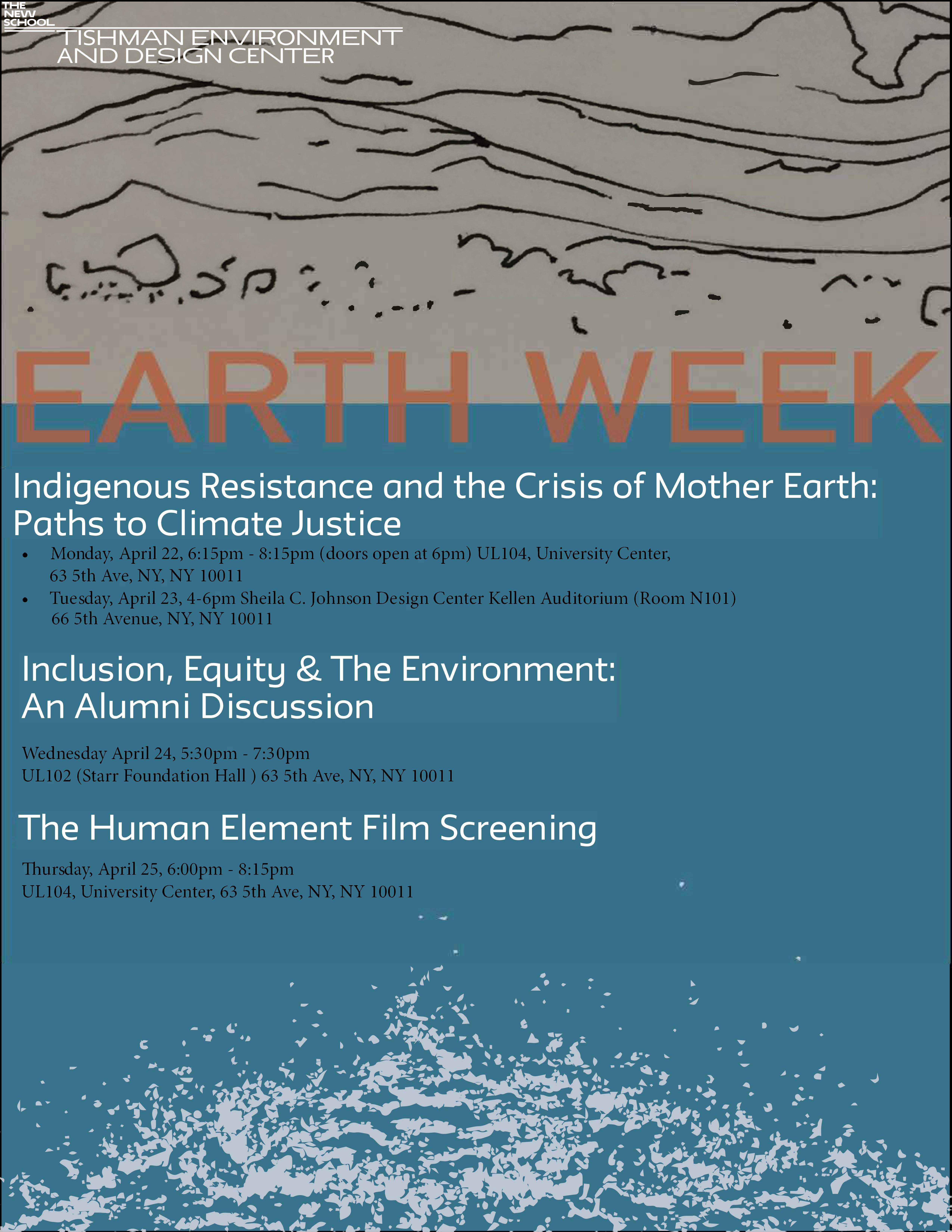 - 2018 Earth Week Flyer with events such as Indigenous Resistance and the Crisis of Mother Earth: Paths to Climate Justice, Inclusion, Equity & The Environment: an alumni discussion and The Human Element Film Screening.