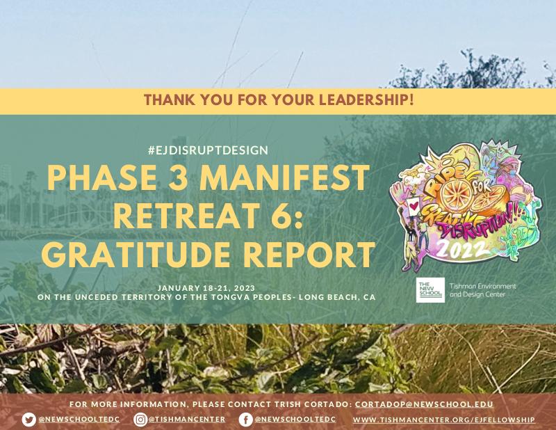 Report: Gratitude Report from the EJ Movement Fellowship's Jan. 2023 Retreat in Long Beach, CA Report from Environmental Justice Movement Fellowship's retreat, held on January 18-21, 2023 on the unceded territory of the Tongva peoples, also known as Long Beach, CA. The retreat was part of Phase 3: Manifest of this fellowship cohort. -