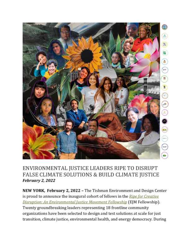 Press Release: Feb. 2, 2022 Announcement of Inaugural EJ Movement Fellows (English) Announcement by The Tishman Environment and Design Center of the inaugural cohort of fellows in the Ripe for Creative Disruption: An Environmental Justice Movement Fellowship.