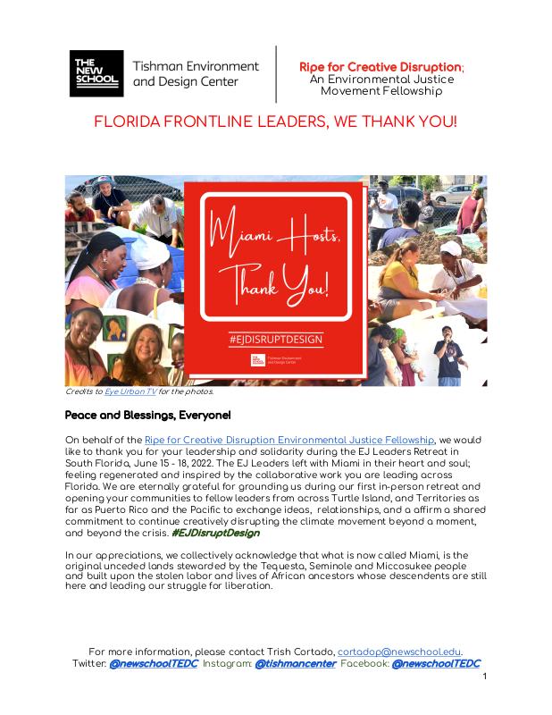 Report: Gratitude Report from the EJ Movement Fellowship's June 2022 Retreat in South Florida A gratitude report, thanking Florida EJ leaders for their leadership and solidarity in hosting the Environmental Justice Movement Fellowship during their retreat in South Florida, held June 15-18, 2022. -